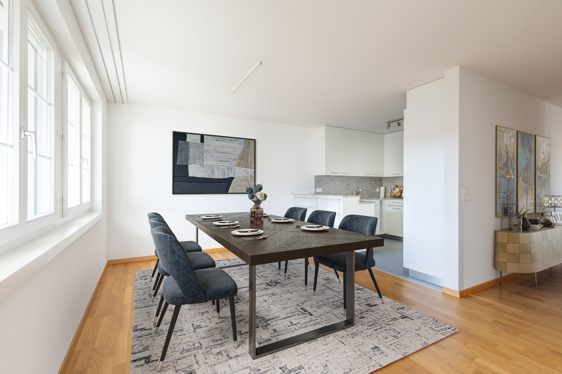 Der Blick auf Landwirtschaft, Golfplatz und Wald lädt zu Freizeitaktivitäten aller Art ein. Die gute ÖV-Anbindung erschliesst Zürich, Winterthur und Flughafen optimal. Der grosszügige Grundriss bietet Raum für vielfältige Lebensstile (Familien, Arbeit-Wohnen) in moderner, offener Ausstattung.