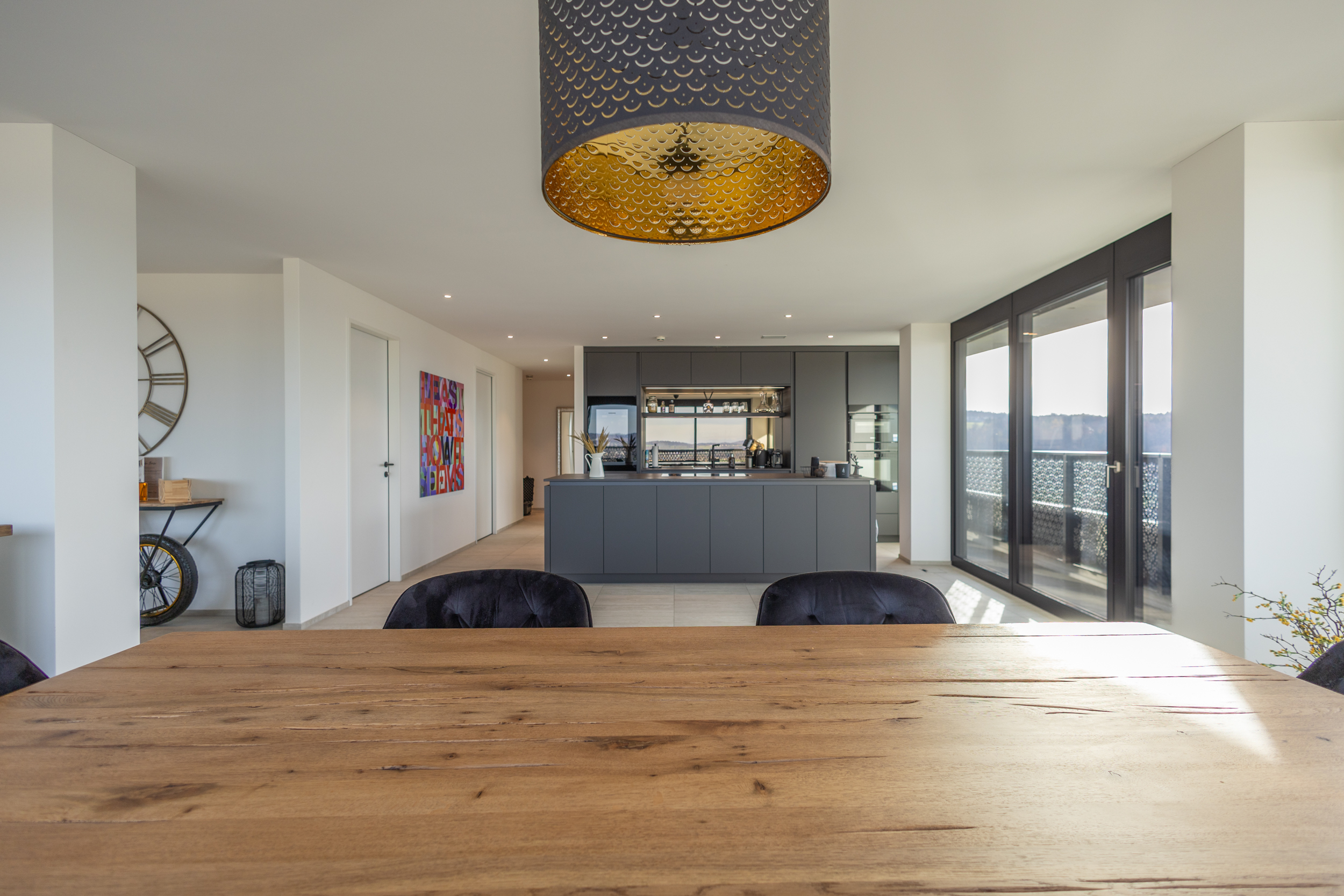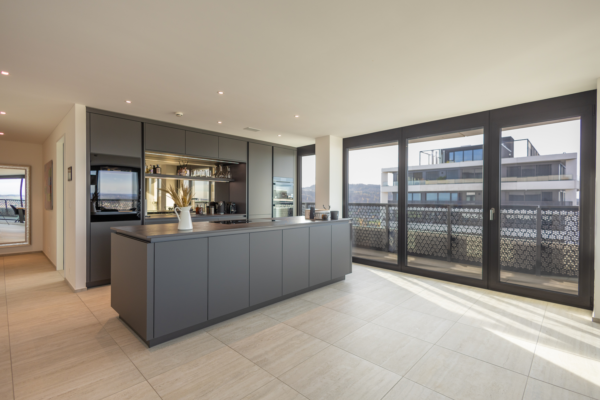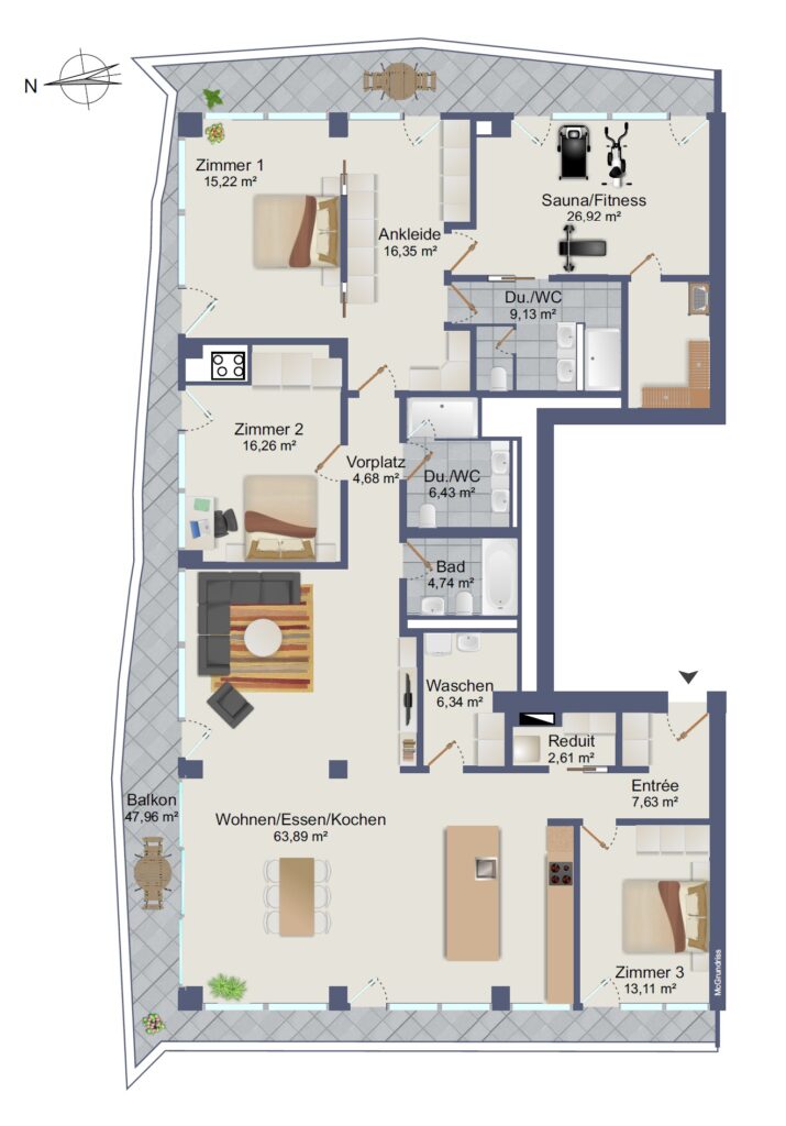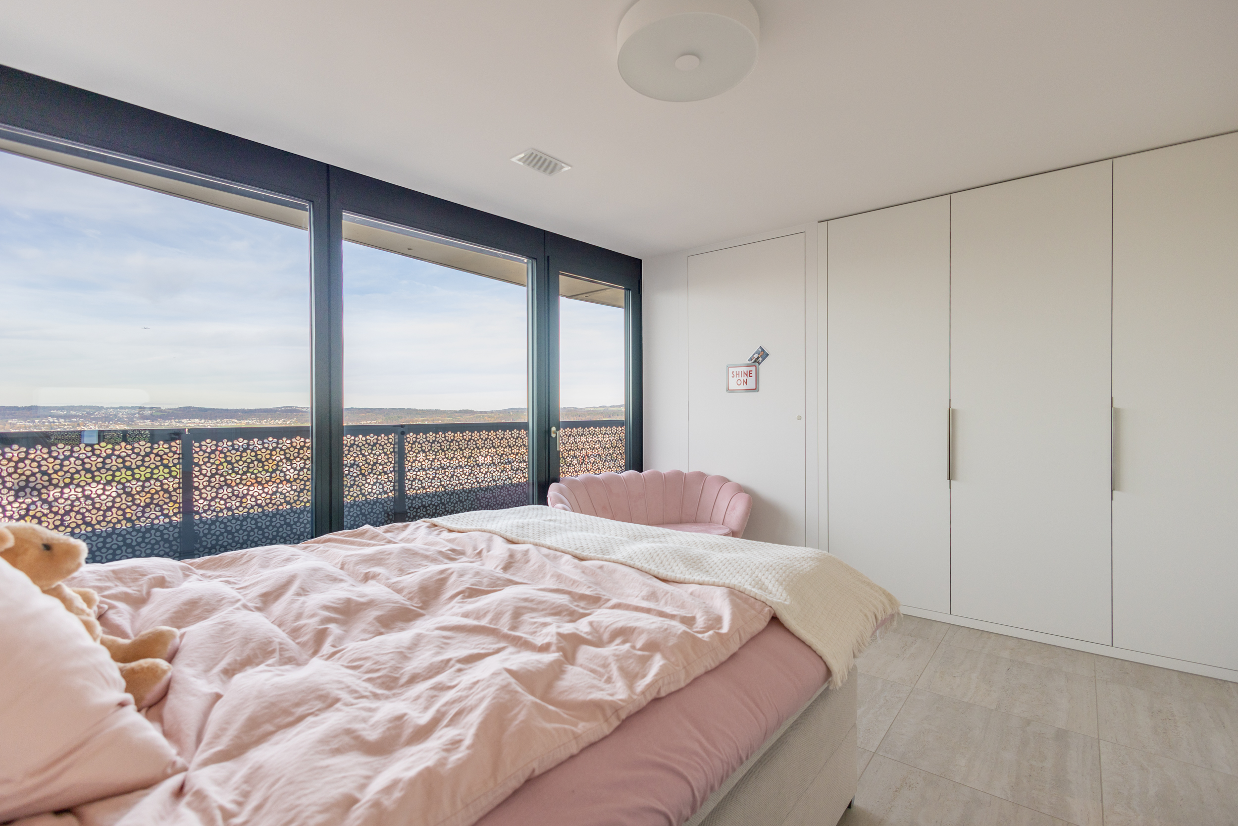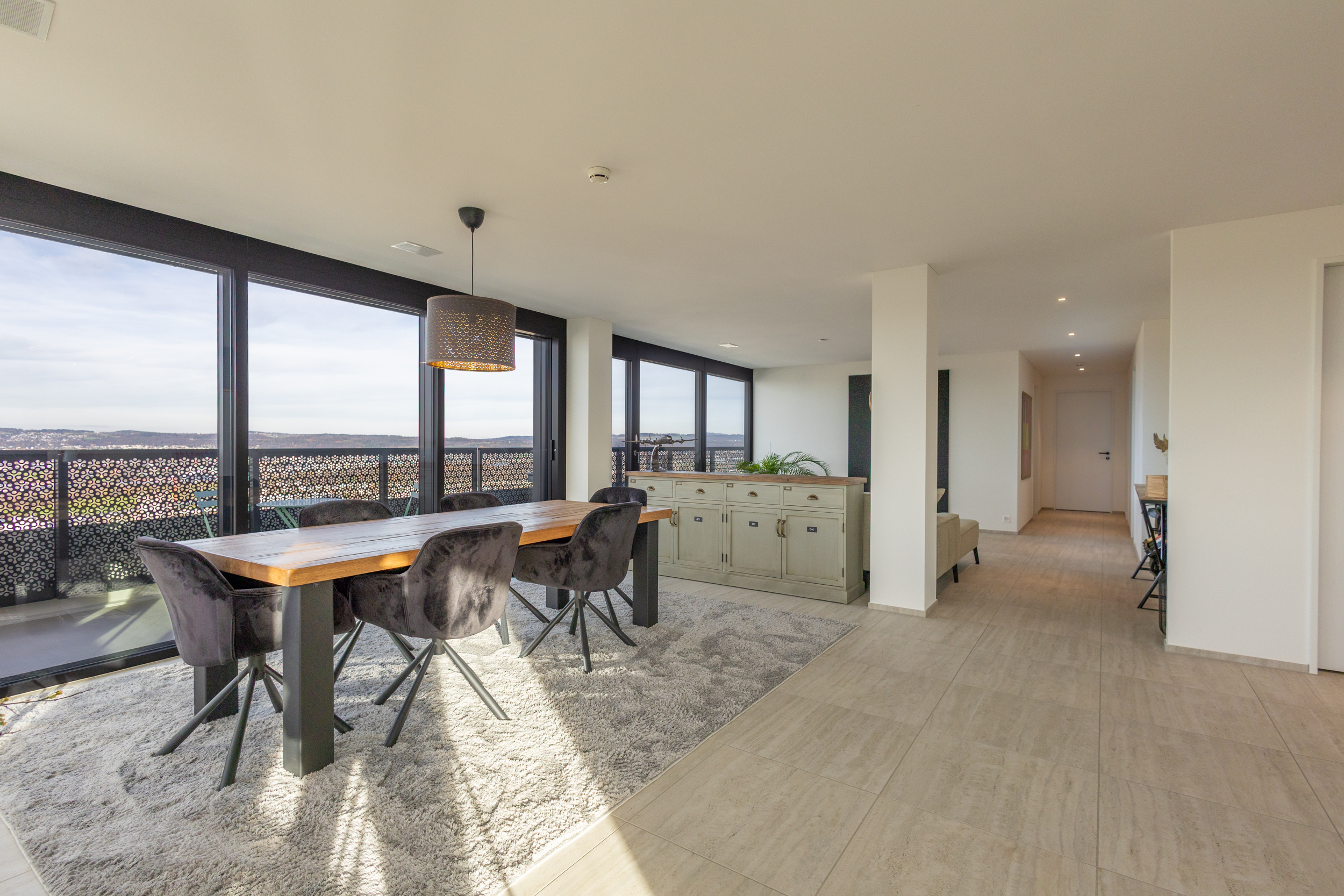 Mit einer grosszügigen Wohnfläche von 207m² und einem zusätzlichen Balkon von weiteren 48 m², der von jedem Zimmer aus zugänglich ist, bietet dieses einzigartige Juwel unvergleichliche Wohnqualität. Es gibt in dem ganzen Projekt „Three Point“ nur sehr wenige Wohnungen mit einer solch grosszügigen Wohnfläche. Geniessen Sie einen atemberaubenden Ausblick von Westen bis nach Osten, über die Skyline von Dübendorf, den nahe gelegenen Greifensee sowie die majestätische Berglandschaft, eingebettet im höchsten der drei Türme des Projektes „Three Point“.