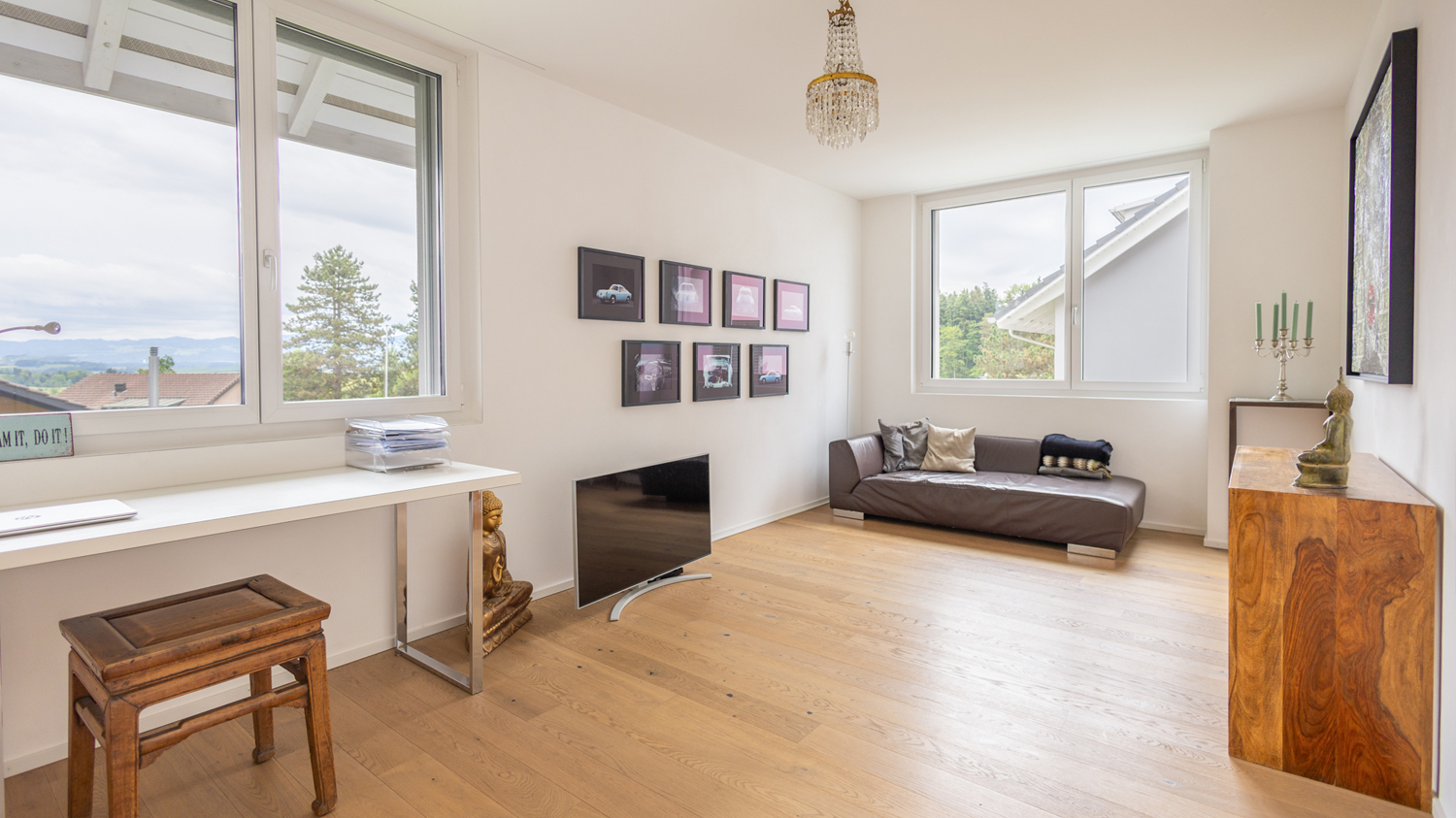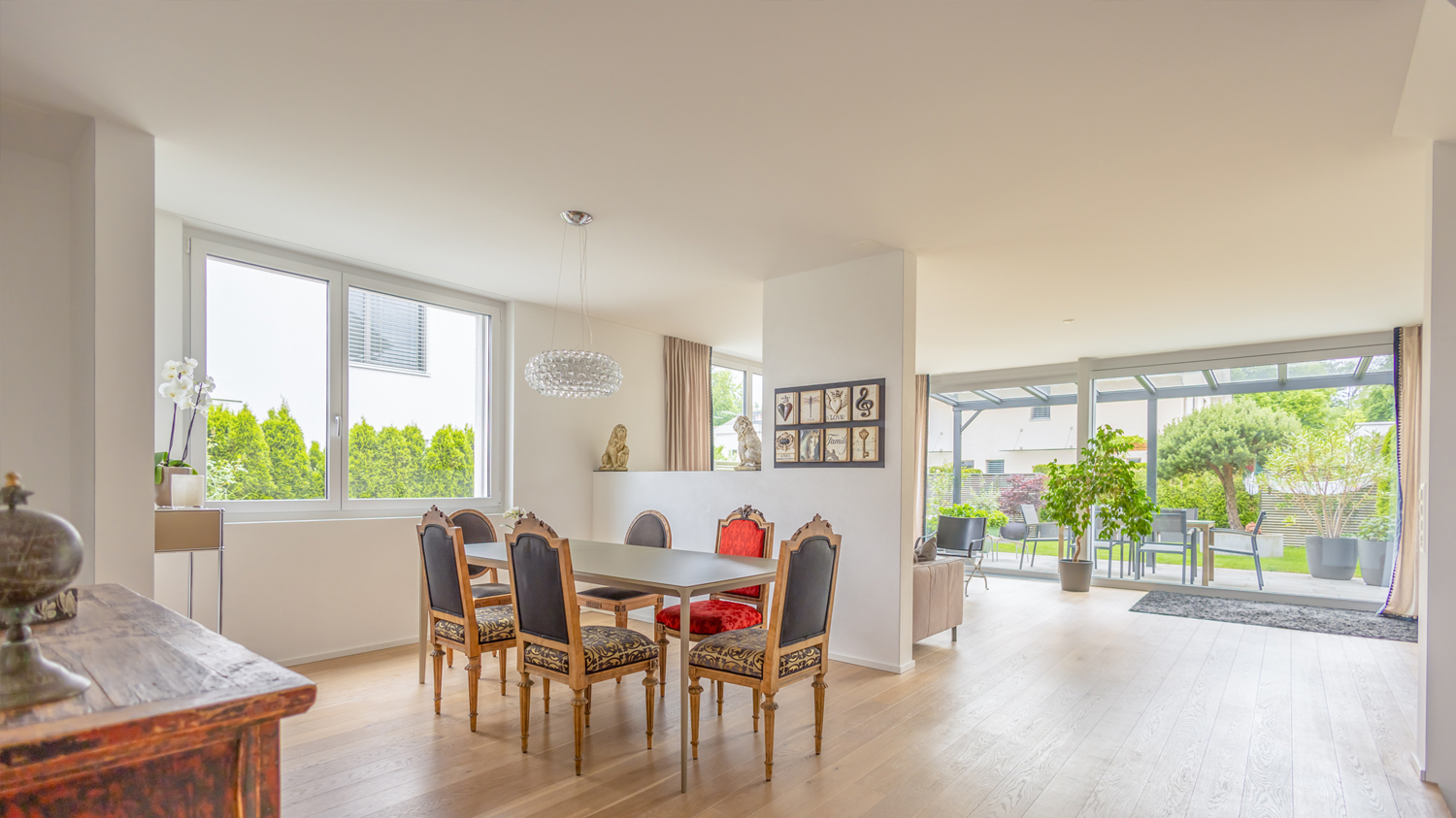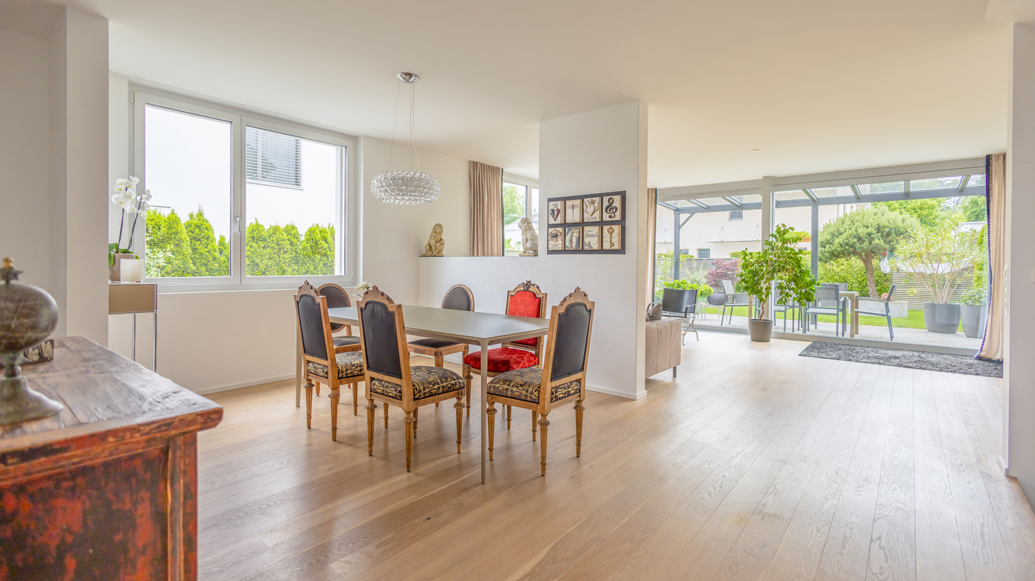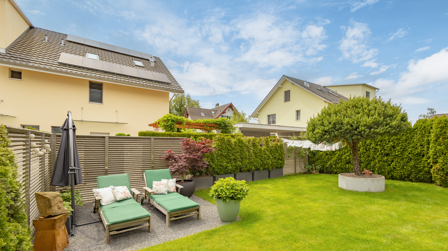 Modernes 4.5-Zimmer-Doppeleinfamilienhaus in ruhiger Lage. Dieses im Jahr 2016 erstellte Doppeleinfamilienhaus mit rund 165 m² Bruttowohnfläche durften wir erfolgreich vermitteln. Die Liegenschaft befindet sich an sonniger, ruhiger Lage und überzeugt durch ein naturnahes Wohnumfeld. Das neuwertige Haus besticht durch grosszügige, lichtdurchflutete Räume mit hohen Decken und raumhohen Fenstern. Weissputz und geölter Eichenparkett schaffen eine stilvolle und warme Wohnatmosphäre. Ein überdachter Sitzplatz sowie ein liebevoll angelegter Garten erweitern den Wohnraum ins Freie. Elegante Schlafzimmer und hochwertig ausgebaute Badezimmer unterstreichen den gehobenen Ausbaustandard. Ergänzt wird das Raumangebot durch praktische Kellerräume, einen hellen Hobbyraum mit Gartenzugang, einen ausgebauten Estrich sowie zwei direkt vom Untergeschoss zugängliche Garagenplätze. Eine moderne, gepflegte Liegenschaft mit hoher Wohnqualität in ruhiger Umgebung.